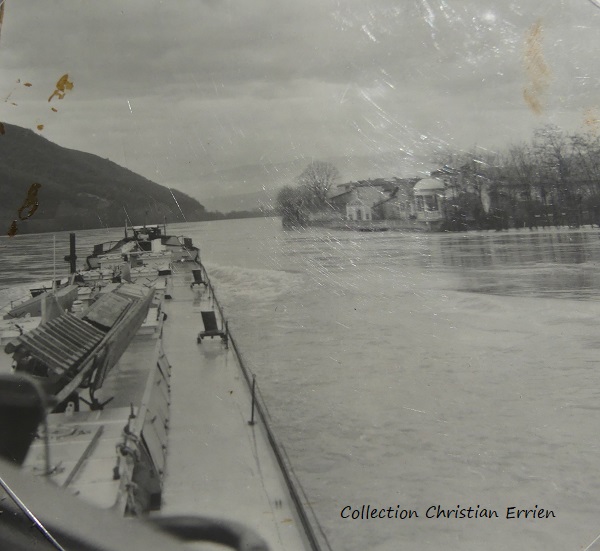 Il s'agit donc d'une descente du Rhône par temps de crue à bord d'un CITERNA. La seule photo prise à quai est malheureusement floue. On voit le capitaine à la barre et un bateau démarquisé pour passer sous les ponts ; il devait y avoir pas mal d'eau. J'ai numéroté les photos afin de pouvoir nommer les lieux si vous connaissez.
