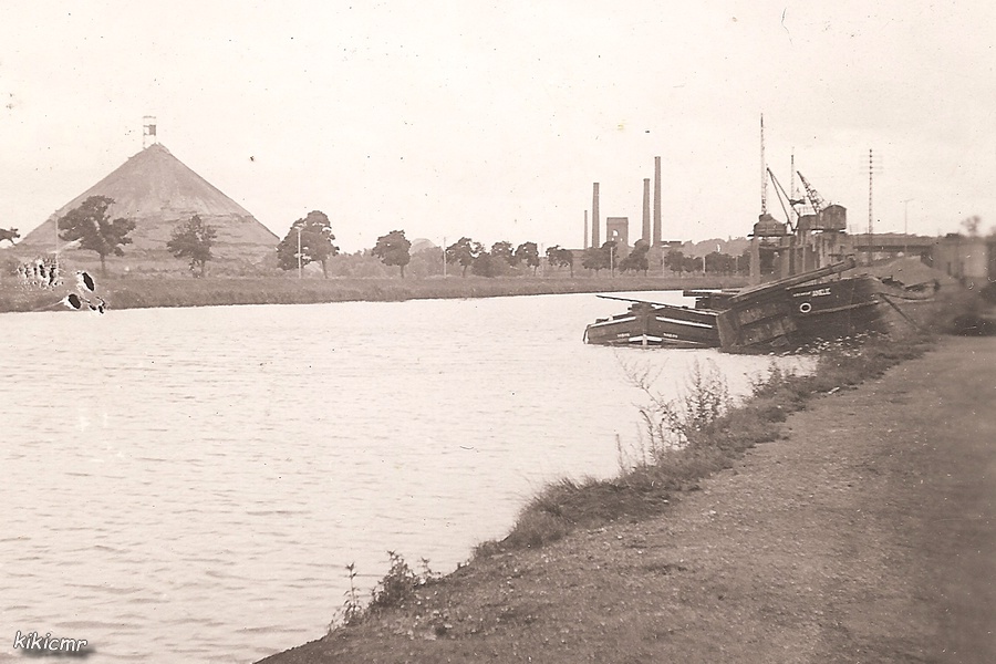 La légende manuscrite au dos, en allemand, indique que ce sont deux bateaux coulés au port de Nancy. Pour être plus précis, c'est dans le large de Bonsecours, sur le canal de la Marne au Rhin ; à gauche, on voit le crassier de la Californie et à l'arrière-plan, l'Usine du Bas à Jarville (aciéries et hauts-fourneaux).