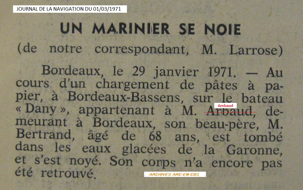 1973, le bateau a été coulé pour renforcer les berges de l’ile d’Arcins à Bègles.