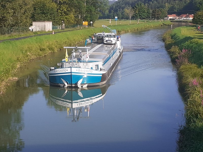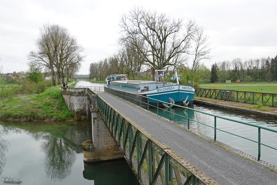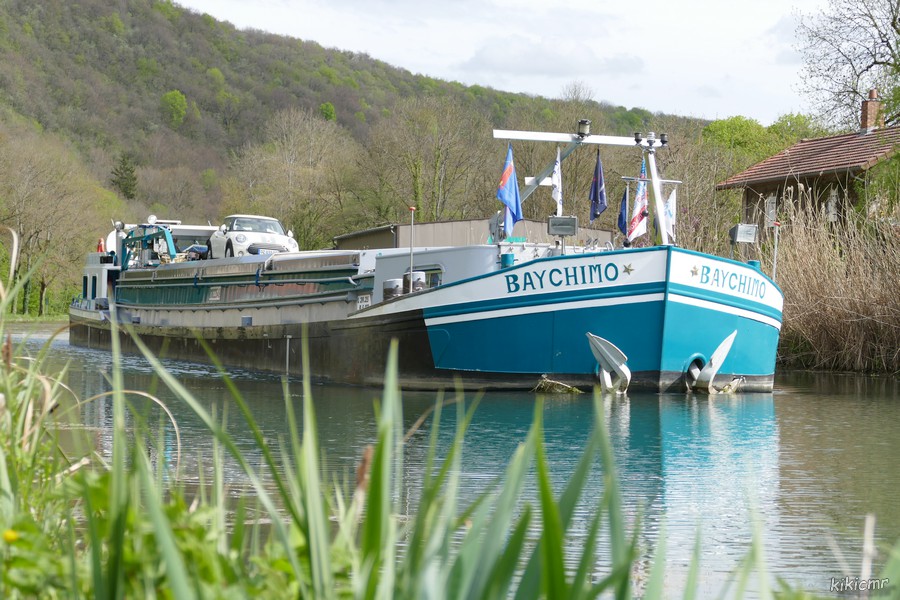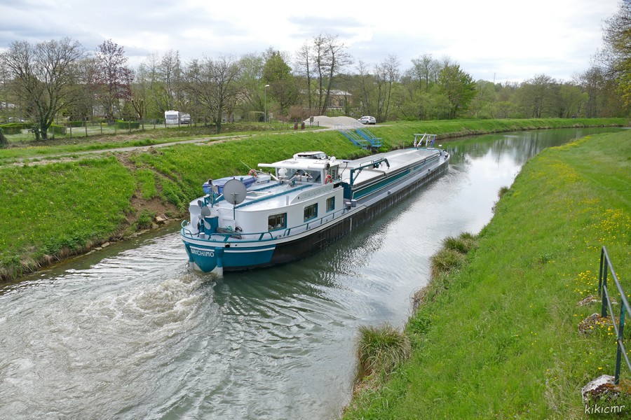 - et le 29 avril 2023 à l'aval de l'écluse de Riaucourt, devant le colombier, et dans le pont-canal de Bologne (52), chargé de 198 tonnes de clinker d'Arles pour Dunkerque :