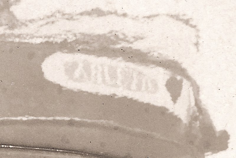 Mais la devise n'est pas lisible directement sur l'épaulure, cette zone de la photo étant un peu trop surexposée. Heureusement, on a le reflet dans l'eau ! En faisant pivoter et en retournant horizontalement l'image, le nom apparaît presque complet : on reconnaît un A, un B, un L, un E et on devine facilement les deux T qui suivent, on peut donc reconstituer le nom du poisson.