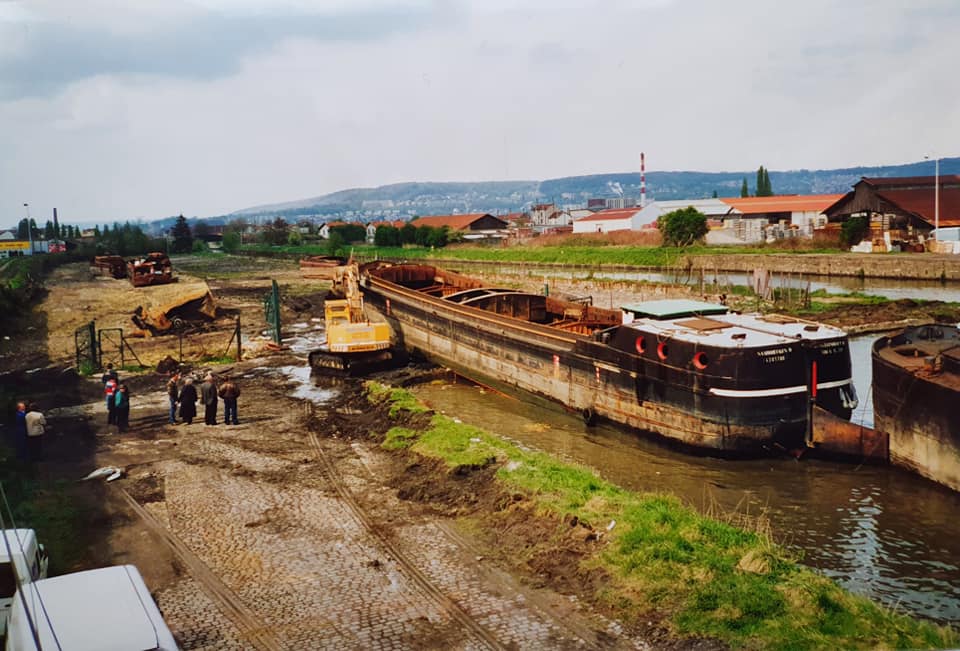 Le WELLENBRAUT au déchirage, au printemps 1991, à Bonsecours (Nancy), sur une photo publiée par Jacky B. dans le groupe Facebook Voies navigables du Nord-Est : on voit bien la dunette, rajoutée sur une construction plus ancienne.