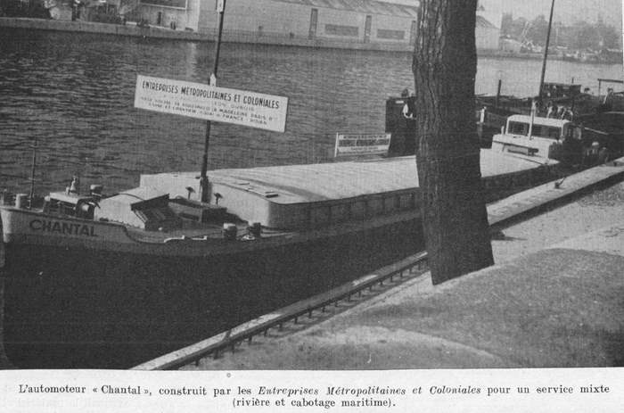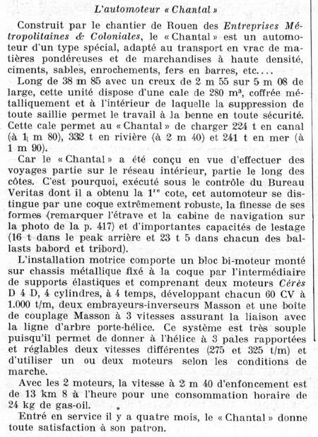 Le CHANTAL était présenté au XVe Salon international des industries maritimes et fluviales, qui s'est tenu la première quinzaine d'octobre 1949 à Paris ; "La navigation du Rhin - Revue de la navigation intérieure" d'octobre 1949 nous en parle :