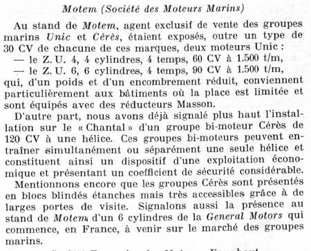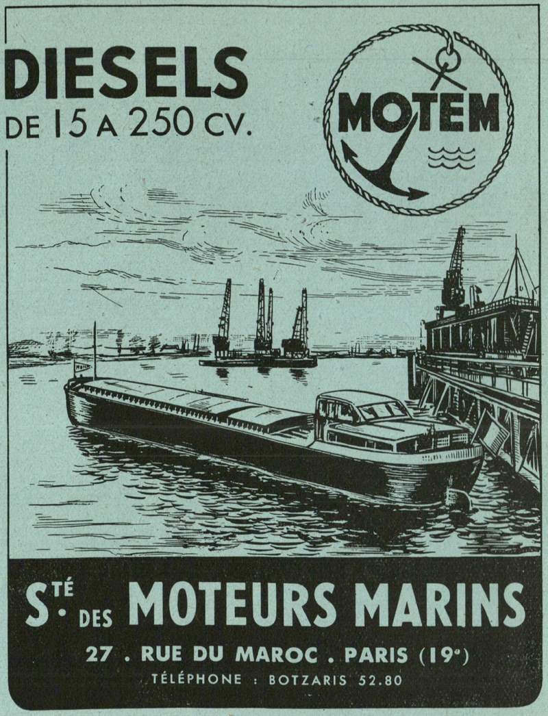 Sauf que j'avais souvenir d'avoir lu, dans le document figurant dans le commentaire juste au-dessus, qu'il était équipé de moteurs Cérès ; j'ai donc cherché à en savoir plus, je n'ai pas trouvé de lien entre Motem et Cérés sur internet, je suis donc retourné dans "La navigation du Rhin - Revue de la navigation intérieure" d'octobre 1949 ; en effet, cette revue n'a pas fait que présenter les bateaux à flot au XVe Salon international des industries maritimes et fluviales, mais aussi les stands des motoristes ! Ce que, je dois bien avouer, j'ai survolé très rapidement... Et voilà sur quoi je tombe : Motem est agent des moteurs Cérès ! CQFD !