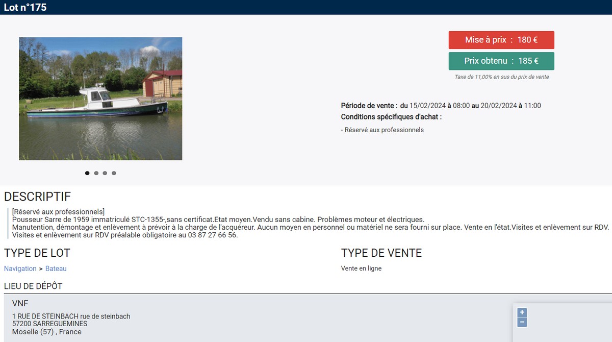 Ce pousseur a été mis en vente en début d'année et il était destiné au déchirage. Voici l'annonce parue sur le site des ventes de France Domaine :