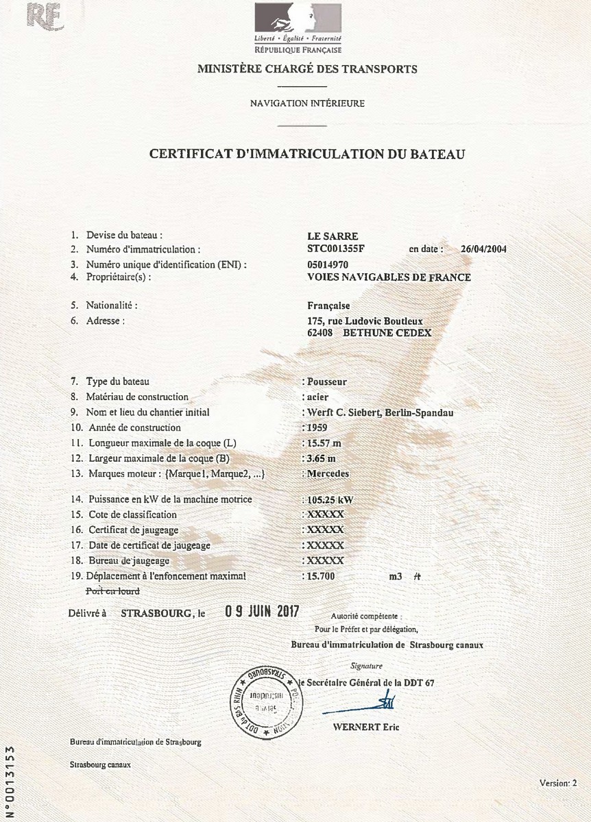 CERTIFICAT D'IMMATRICULATION DU BATEAU