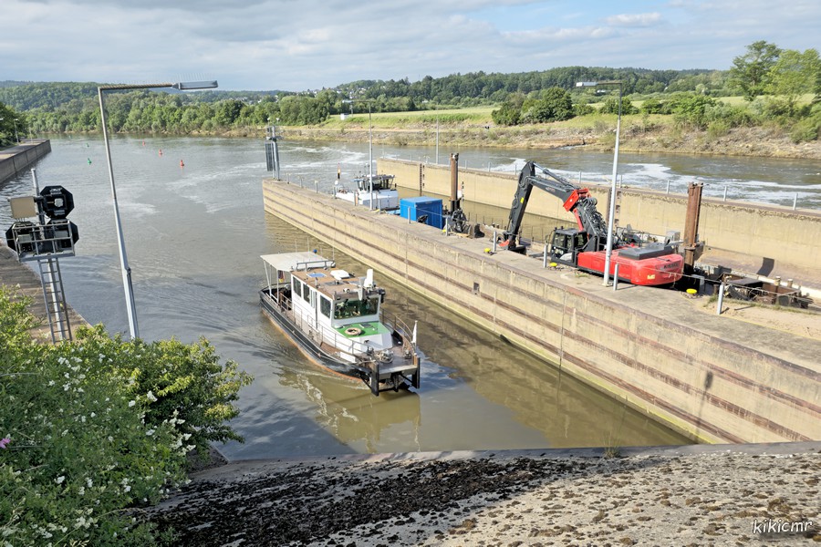 Office des voies navigables et de la navigation) Mosel-Saar-Lahn. Longueur 14,80m, largeur 3,80m, tirant d'eau 0,95m, il a été construit en 1999 au Schiffswerft Hermann Barthel de Derben, sur l'Elbe. Le voici de passage à l'écluse de Rehlingen (D), sur la Sarre, le 4 juin 2024 ; il doit avoir pas mal de boulot suite à la grande crue d'il y a quelques semaines :