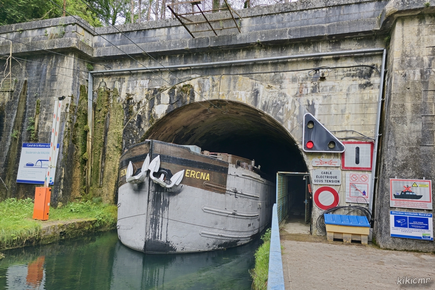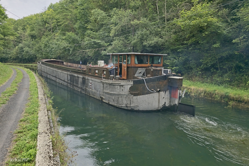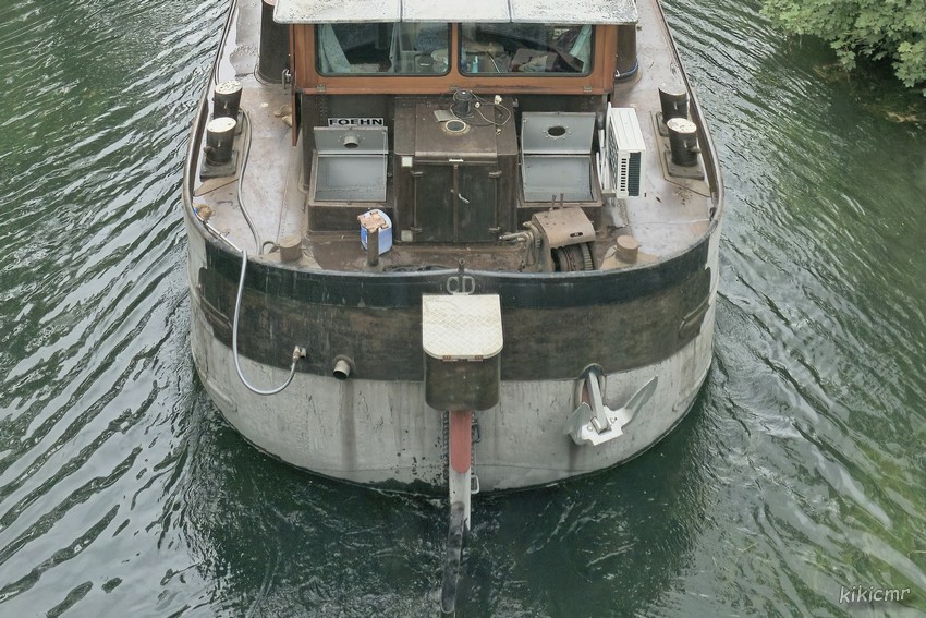 FOEHN car il a changé de devise ! Ça ne se voit pas encore de trop, mais c'est un contact chez VNF qui m'a dit que chez eux, il était annoncé sous ce nom ; alors j'ai épluché mes photos et effectivement, sur celle-ci prise depuis le pont à l'entrée du village de Mauvages, on peut voir que c'est écrit derrière la marquise, presque caché par un capot ouvert, à gauche :
