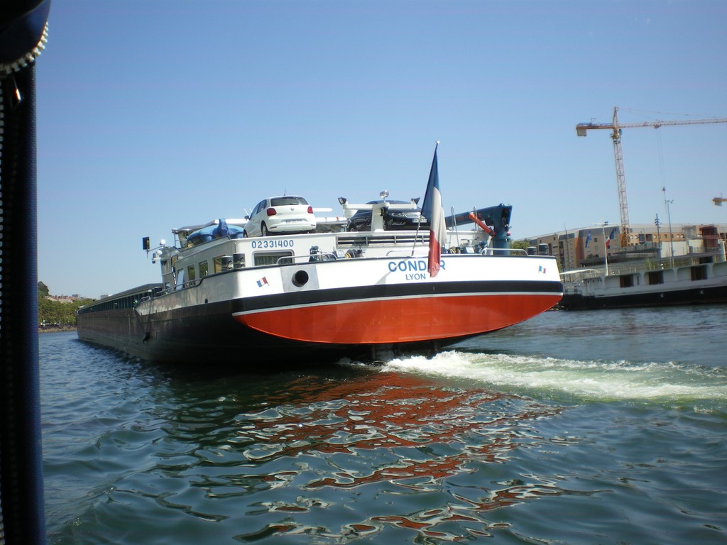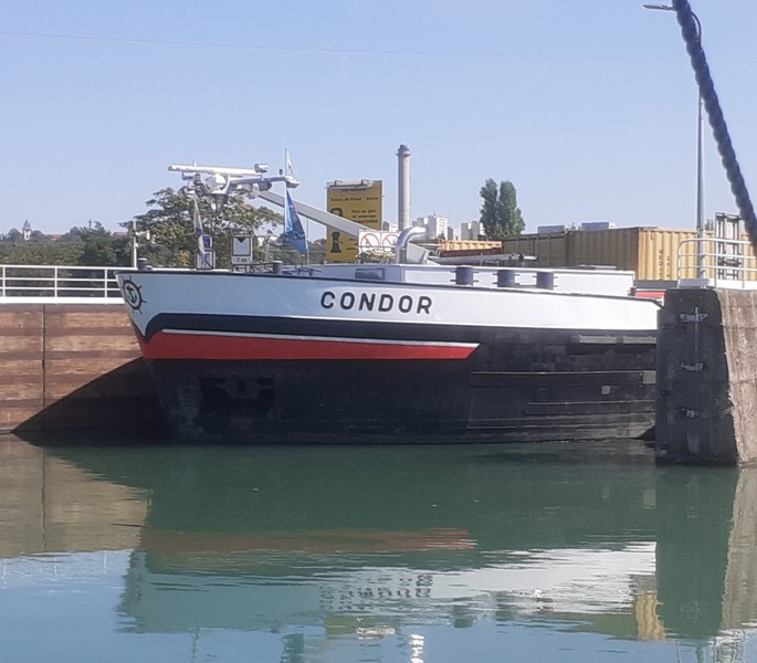 Je l'ai suivi pendant son éclusée à Tarascon, ce vendredi 29/01/2016 vers 10 h 30. Avalant, il était chargé de billes de bois pour l'usine de pâte à papier située juste en aval. C'est effectivement un superbe bâtiment. Après avoir attendu le feu vert, il est en entré et sorti "au pas", et n'a vraiment accéléré qu'à la sortie du musoir aval.