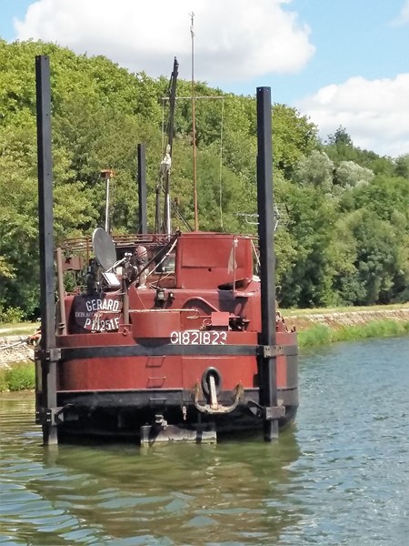 Le GERARD est à St. Jean de Losne maintenant. Il y a deux ans que le batelier avait fait son dernier voyage. Maintenant il obtient une pension et il semble qu`il veut rester à St. Jean de Losne, ou il a la permission de VNF pour rester hors de la ville. Le batelier veut construire qc. pour amarrer - on peut voir des équerres soudées à la coque avant et arrière et on peut voir aussi les tubes carrés sur le bateau. Au moment, il a encore besoin de la echelle et du bachot pour aller à la terre.