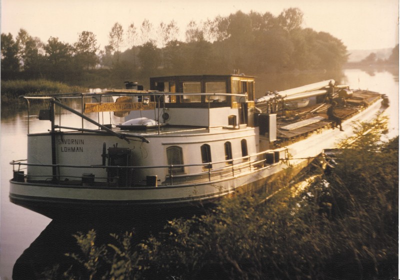 Le Savornin Lohman sur l'Yonne en 1960, le mat de charge va etre monte le lendemain pour charger des grumes a Pont sur Yonne pour l'allemagne.