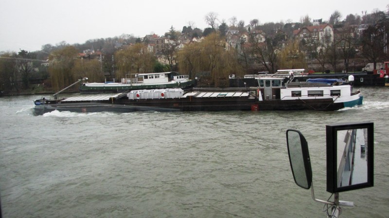 le pousseur INTRAITABLE avec une barge RORO qui vient du HAVRE et se rend aux MUREAUX avec un colis qui decoiffle