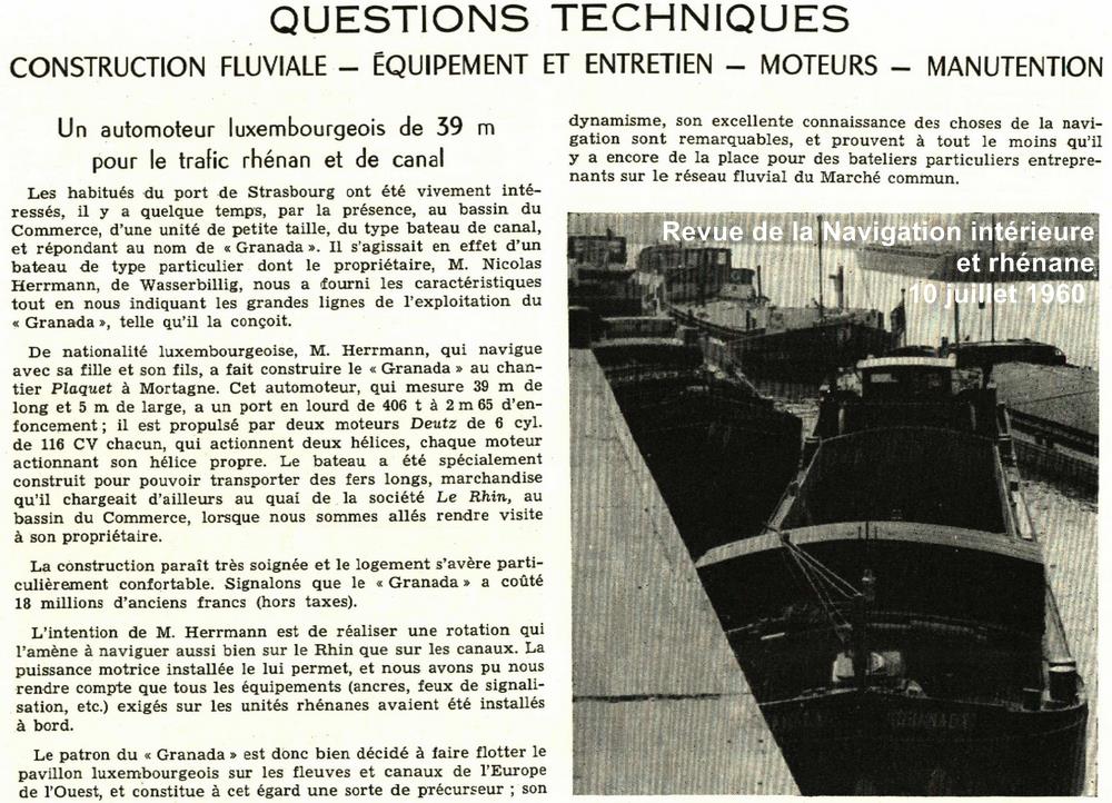 Ce bateau a fait l'objet d'un article dans le numéro de la Revue de la Navigation intérieure et rhénane en date du 10 juillet 1960 :