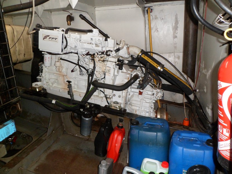 il est équipé de 2 moteurs de propulsion , 2 X 100 cv Perkins et ces moteurs ont une particuliaritées,les lignes d'arbres passent sous les moteurs