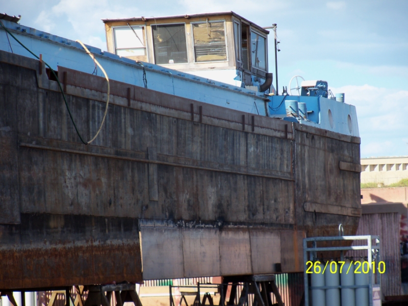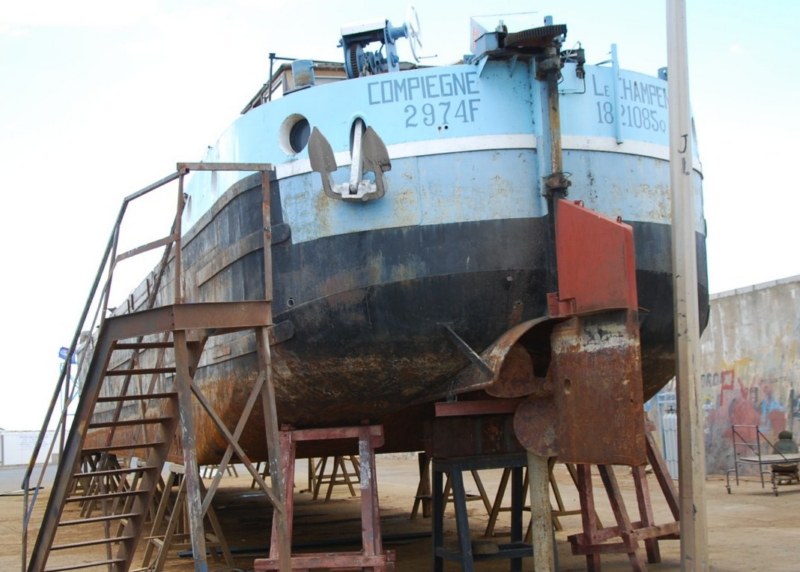 Arrivé quelques jours passés en cale sèche de Sète , ce bateau vient d'être raccourci d'une dizaine de mètres sans doute pour devenir un bateau logement sur le canal du midi ( je n'ai vu personnes et par conséquent pas d'infos ) .