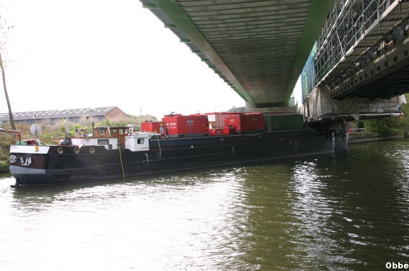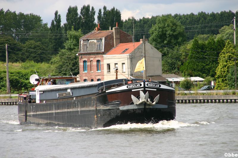 DARGILAN partait d'Arleux vers le chantier de Beez, avec, pour une dernière fois, Annie et William au macaron. Il sera raccourci à 30 mètres puis, par Nieuport, rejoindra l'Angleterre, où il servira de bureau sur la Tamise (photo et infos Roger Thiais et Cindy Caillez) :