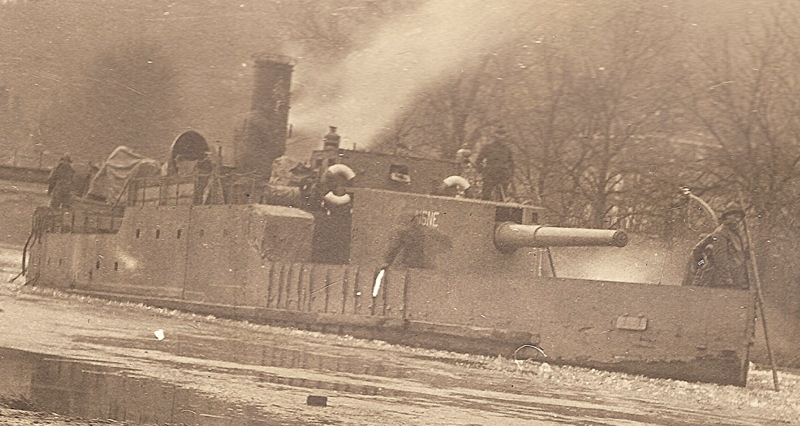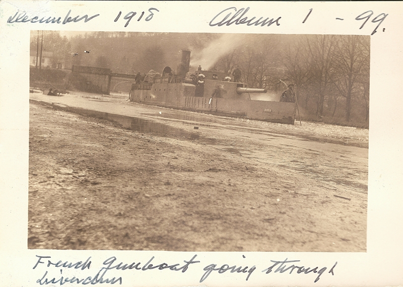 Il s'agit d'une canonnière fluviale, l'une des douze utilisées par l'armée de terre sur les rivières et les canaux du Nord et de l'Est de la France. Elle a été construite en 1915 (de mai à juin) à Lorient. Elle porte à l'origine la lettre C, qui lui donnera le surnom de Cruelle (la A devient Ardente, la B Brutale, etc...). Elle combat dans le Nord, la Somme, l'Oise, en Champagne, en Belgique... C'est en décembre 1918 qu'elle devient l'AISNE, quand elle est affectée à la flotille du Rhin, nouvellement créée pour pacifier les rives du plus important fleuve d'Europe. Je n'ai pas trouvé de renseignements sur sa vie dans la flotille, et elle disparaît en 1929. Je pense que, vu la date d'affectation à la flottille du Rhin, la photo a été prise au moment où le bateau allait rejoindre le fleuve.